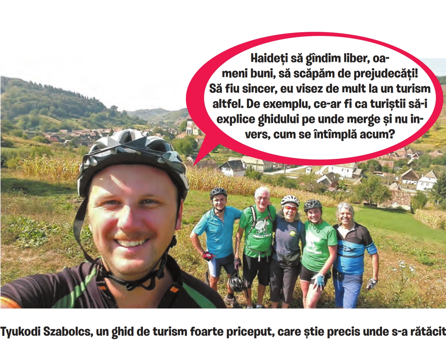 T.S: Bingo! Experiențe, în primul rând, experiențe; bere rece în crâșma satului, curs de cosit în cască de protecție, apus de soare cu ciurda mergând acasă, o scurtă oprire la ciobani să vadă și ei cum se face telemeaua, iar, între două file de istorie, le mai zic cum am reușit să construim cea mai scumpă autostradă din Europa și c-avem un guvern ce-și dă jos premierii, la rând, ca la moară. Să aibă o imagine complexă. Iar toate astea cu bicicleta. Sau în plimbare. Neapărat să fie ceva mișcare.