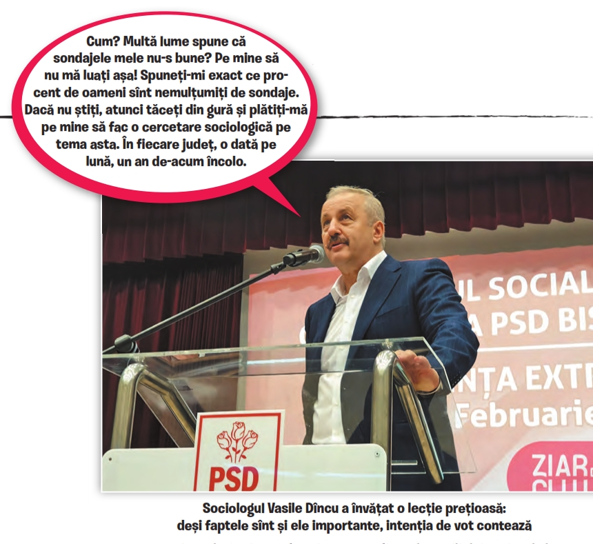 Un social-democrat cum e Vasile Dîncu știe că nu se poate baza pe pensia specială de senator, pentru că n-a prins decît un mandat, între 2004 și 2008. Nici ca europarlamentar nu prinde ceva pensie, că n-a servit țara decît din ianuarie pînă în mai 2007. De pensionat la 40 și ceva de ani n-a putut, pentru că de astfel de avantaje beneficiază doar cadrele active, nu și acoperiții. Așa că iată-l, la aproape 59 de ani, în bătaia vîntului și a vremilor, pîndit pe la colțuri de sărăcie. Glumim. Vasile Dîncu e orice, numai un social-democrat sărac, nu. În 2015, de exemplu, și-a vîndut parte din acțiunile de la IRES pe frumoasa sumă de 975.000 de euro. Pentru că se plictisise să încaseze, anual, dividende de peste un milion de lei. Dar, totuși, i-au rămas destule acțiuni încît să considere că IRES merită toată implicarea lui, trup, suflet și analiză competentă. Așa că, după cîteva experiențe nefericite pe la exit-poll-uri, unde cifrele se băteau cap în cap cu realitatea, mai ceva decît în sondajele lui Pieleanu, Vasile Dîncu a găsit o variantă să-și finanțeze institutul de sondare a opiniei publice: a luat captiv un partid, cu complicitatea lui Marcel Ciolacu și a cîtorva alți băieți cărora, dacă le bagi o lanternă în ureche, li se vede albăstruiul din spatele irisului. Strateg, președinte al Consiliului Național al PSD, eminență cenușie și păpușar autoproclamat, Vasile Dîncu n-a obligat pe nimeni să facă sondaje cu IRES, anul ăsta, dar oamenii au înțeles care-i mersul istoriei. Așa că, din ianuarie încoace, institutul lui Dîncu a lucrat cu toate motoarele turate, pentru mai toate organizațiile județene ale PSD. Și tot nu i-a ajuns, a mai prestat și pentru PNL, nu doar sondaje, ci mai ales mînării menite să informeze publicul că PSD nu-și susține propriii candidați.