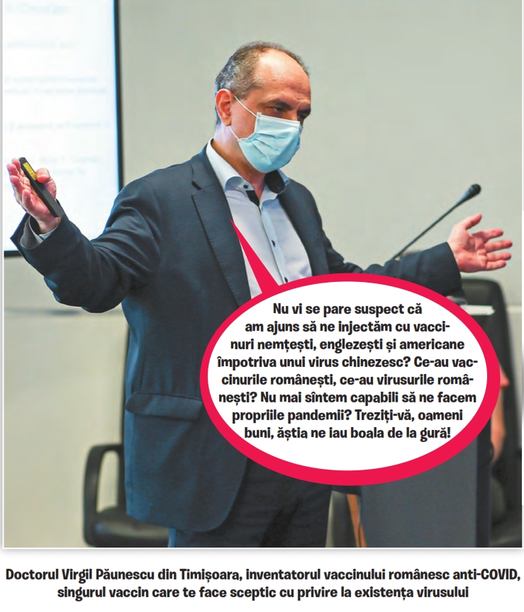 Virgil Păunescu, medic, fost consilier prezidențial al lui Traian Băsescu, personaj albit de către procurori într-un dosar de corupție tocmai datorită apropierii salvatoare de Traian Băsescu, se laudă de foarte multă vreme că a descoperit vaccinul anti-COVID, apare la televizor, își transmite mesajele prin presa scrisă, dar, deocamdată, nu a putut produce proba existenței acestui vaccin.